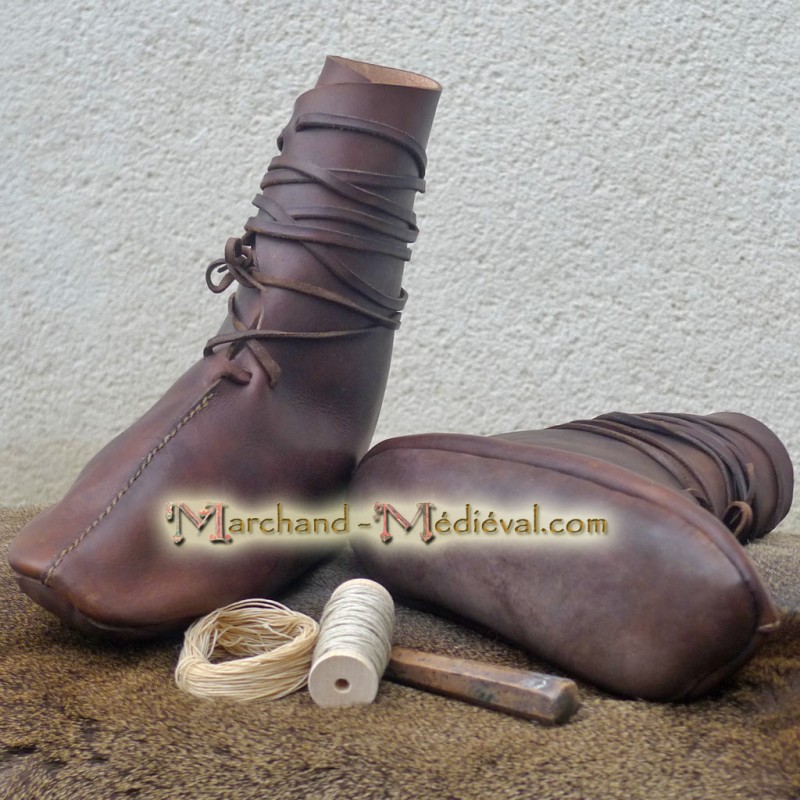 Zapatos vueltos Vikingo ensamblados en el hilo de lino poissé en un cuero de calidad (curtido vegetal) según la técnica historica.