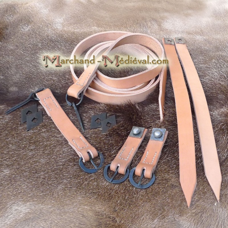 - Les 2 sanglons sont équipés d'une boucle en fer, cousue au point sellier avec un gros fils de lin poissé. Vous devrez fixer l'autre extrémité sur votre bouclier à l'aide d'un rivet et deux carelles (fournitures incluses dans ce kit).